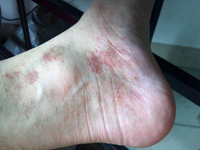 寒冷性多形红斑好发于脚背等末梢循环不好的地方,皮损表现为数个米粒至扁豆大小的暗红色斑,边界相对清楚,顶端有白色纹路,为干燥性鳞屑。
