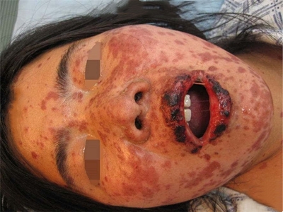 寒冷性多形红斑好发于面部等暴露部位,表现为患者面部布满了大小不等的红褐色斑,形状不规则,与正常皮肤之间的界限清晰,唇部黏膜因水疱破裂而出现黑色结痂。