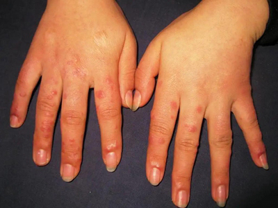 寒冷性多形红斑可在患者手指上观察到,皮损为水肿性丘疹或更大的斑块,呈暗红色,绿豆至黄豆大小,皮损中央颜色较淡,边缘有一圈红晕,患者自觉瘙痒剧烈。