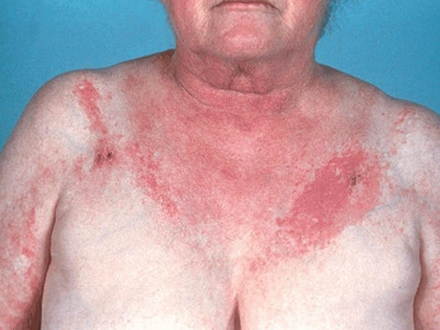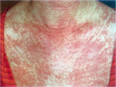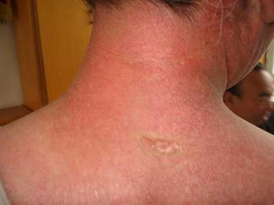3、光敏感:曝光部位出现皮肤红斑,常见于面部、胸部V字区或圆领衫的圆领外皮肤,可出现境界清楚的萎缩性皮炎、红斑、毛细血管扩张、雪茄烟纸样皱缩表现,为光敏感所致;