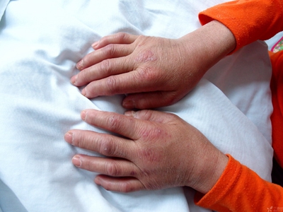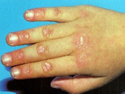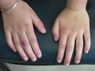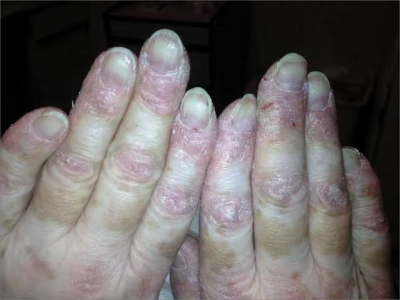 2、Gottron征:指关节、指掌关节背面,肘、膝关节伸侧出现对称性分布的紫红色丘疹,称为Gottron丘疹,这些丘疹处出现毛细血管扩张、潮红和鳞屑现象,称为Gottron征;