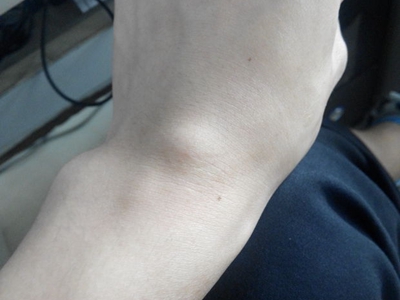 手腕腱鞘囊肿在患者手腕外侧有一个椭圆形的肿块,表面光滑,质地偏软,与皮肤无粘连,是由腕关节和腱鞘松弛引起的过度摩擦导致。