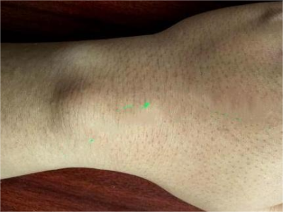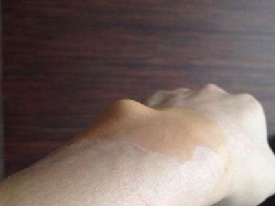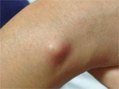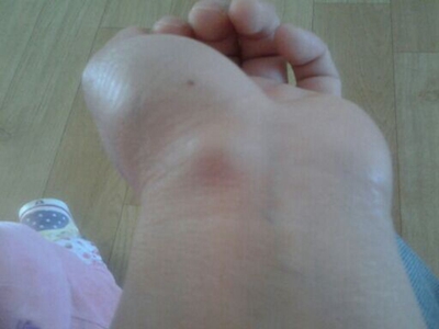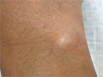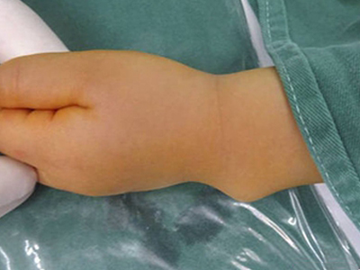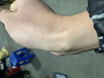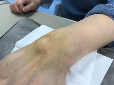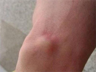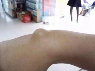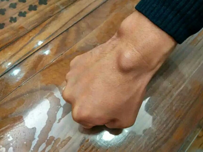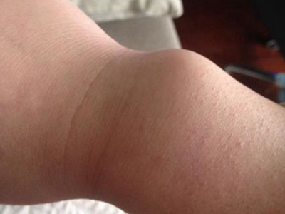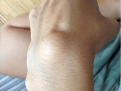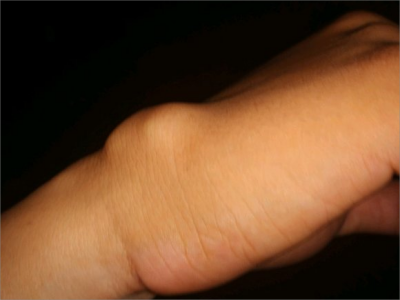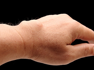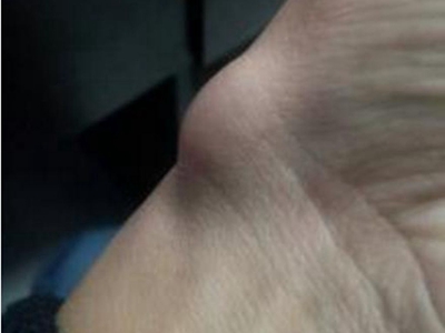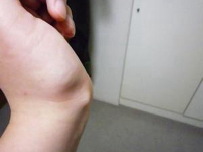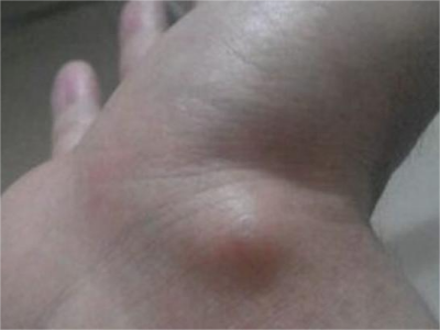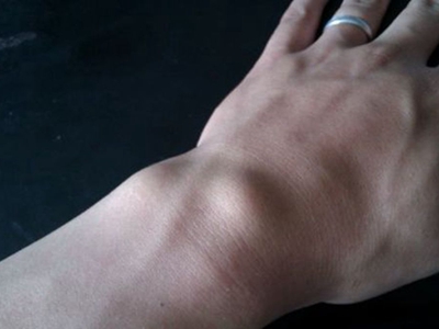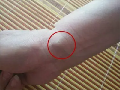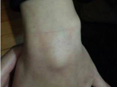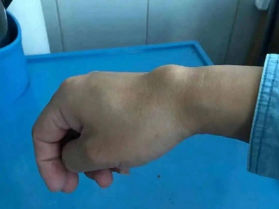 手腕腱鞘囊肿患者将手腕向内侧屈曲时,症状明显,在左手背外侧有一个明显的圆形肿块,表面皮肤泛黄,内部含有明显的黄色黏性脓液。