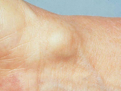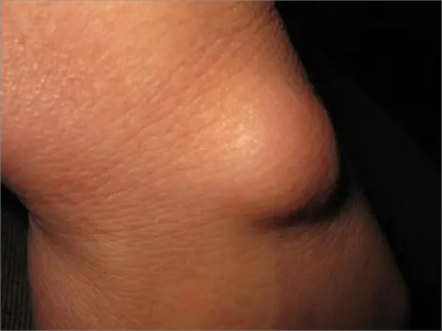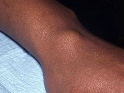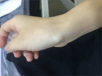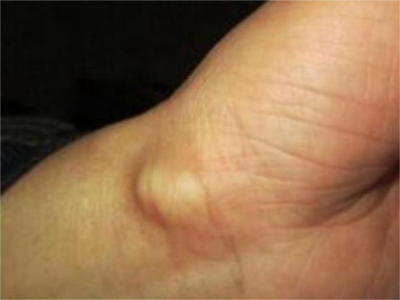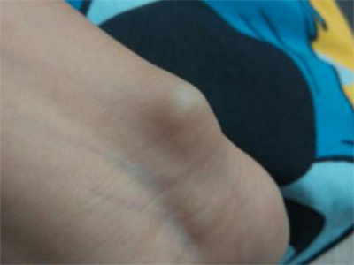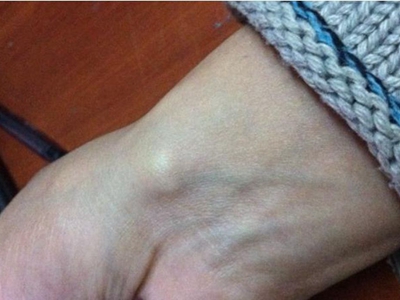 手腕腱鞘囊肿患者左手腕背侧中部出现一个明显的局部半球形肿块,界限清楚,囊肿内容物为胶样液体,生长缓慢,无明显自觉症状或偶感胀痛。