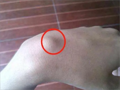 手腕腱鞘囊肿患者在右手腕有一个明显的圆形肿块,肿块表面发红,内含无色透明或微呈白色的黏稠液体,推动有波动感。