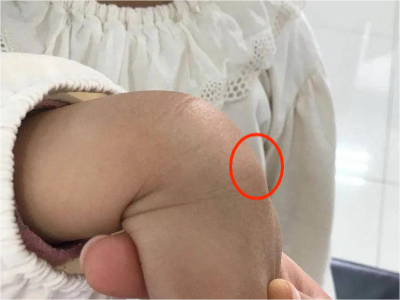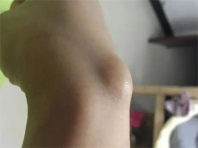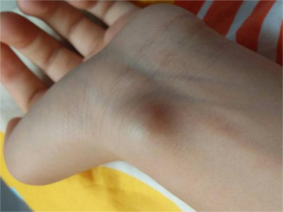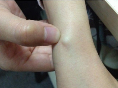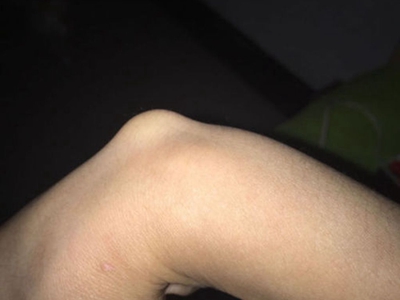 手腕腱鞘囊肿发生在儿童右手腕背部,表现为一个蚕豆大小的小包,内含黏液性物质,虽不与皮肤粘连,但活动性较差,不可轻易推动。
