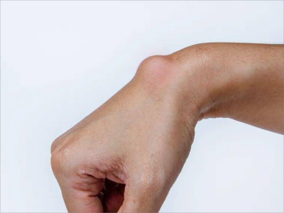 手腕腱鞘囊肿的患者手腕屈曲时症状更加明显,手腕背面的中部有一个明显的圆形肿块,表面光滑,肤色没有明显改变,囊内为胶样黏液。