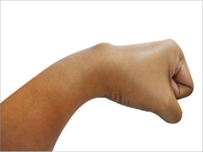 手腕腱鞘囊肿发作时,在患者左手腕外侧出现一个高出皮肤的肿块,将腕关节向掌侧屈曲,则见肿块更加突出,呈明显的圆形隆起。