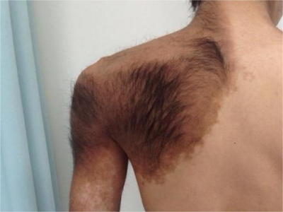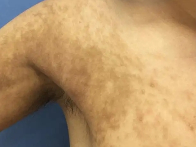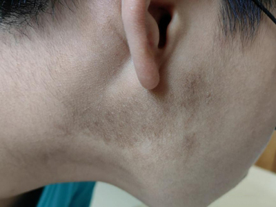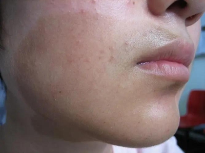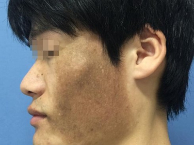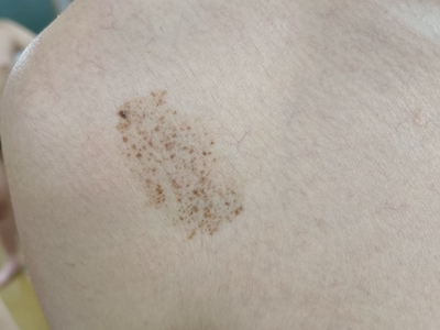 贝克痣发生于面部,皮肤损害为色素增生性斑片,呈棕褐色或黄色,单发,边缘清楚而不规则,偶或多发,融合成网状,斑片纹理稍增厚。