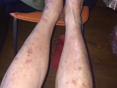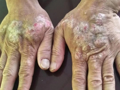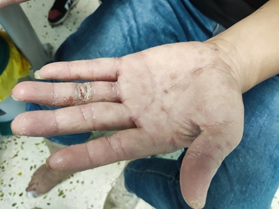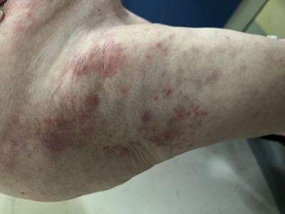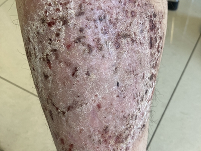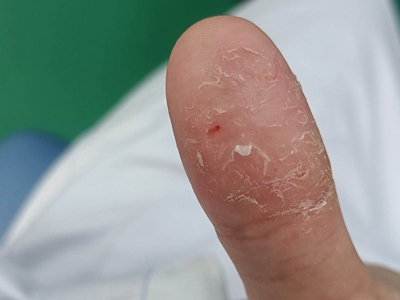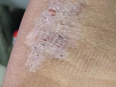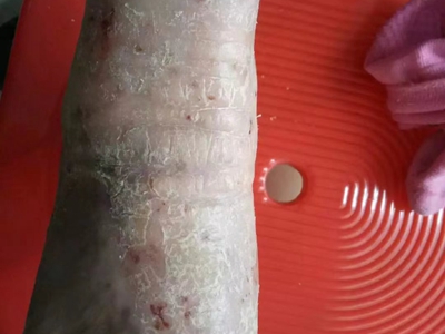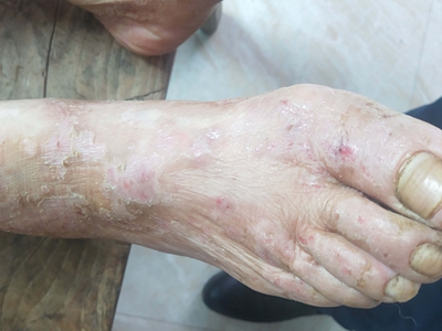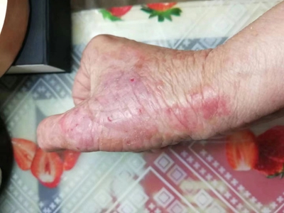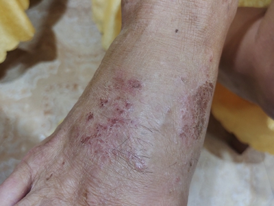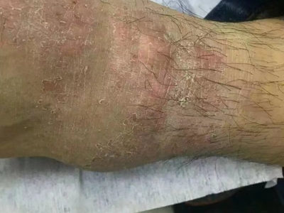 慢性湿疹患者脚部皮肤大面积溃烂,出现浅粉色溃烂面,部分表面已经干燥。同时局部大部分表皮已经剥脱,仅有少量黄褐色痂皮残留。患者常自觉瘙痒。