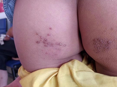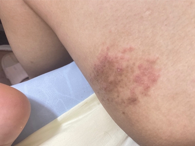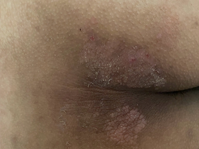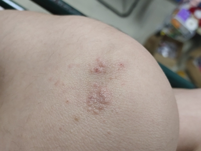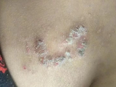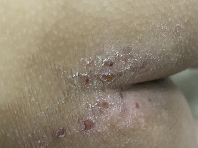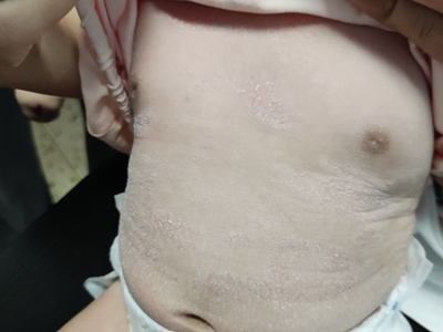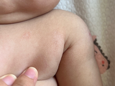 慢性湿疹婴儿肩部有一块红斑,大体呈椭圆形,红斑上有几个突出的小疙瘩,触感凹凸不平,并附着有少量白色鳞屑,伴有明显瘙痒,需涂抹药物治疗。