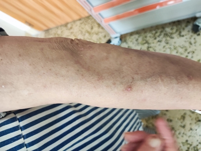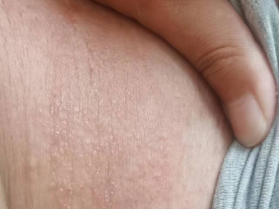 慢性湿疹患者左边耳前有好几个丘疹,丘疹为红色,分散型分布,部分表面稍高于周围皮肤,搔抓后表面有点状的血痂出现,可遵医嘱外用药物止痒治疗。