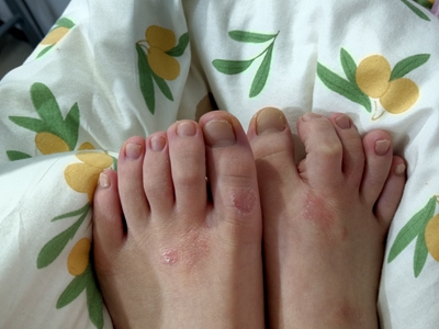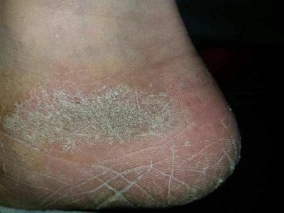 慢性湿疹脚背外侧缘脱落白色皮屑图