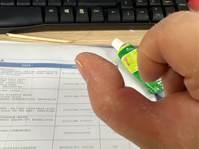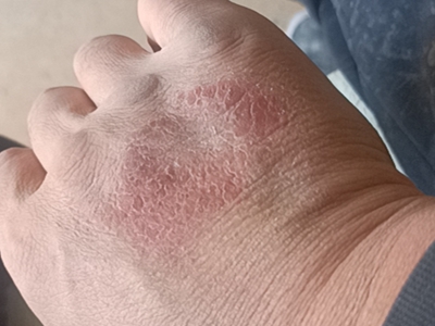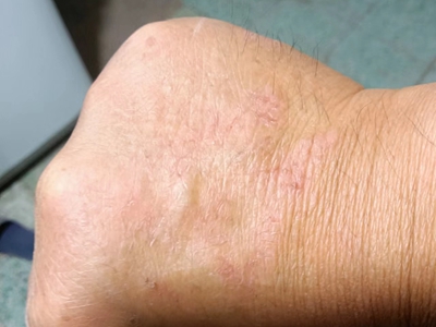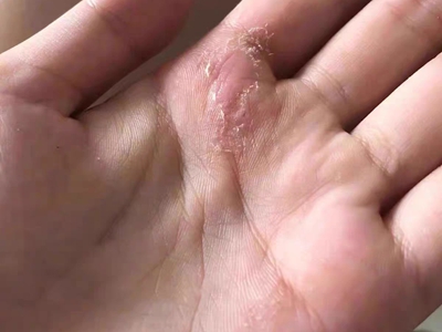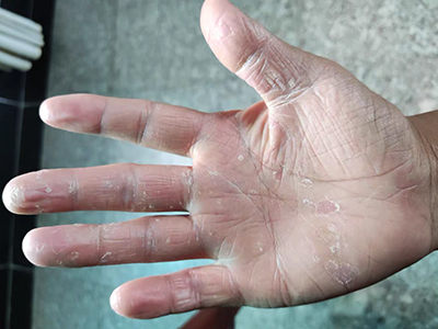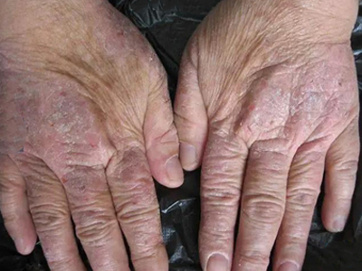慢性湿疹患者足底皮肤出现浸润性暗红斑,周围皮肤增厚、表面粗糙,上覆厚白色角质,搔抓后常出现皮肤脱落等情况,同时伴有皮肤纹路加深,阵发性剧烈瘙痒等症状。