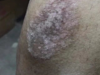 慢性湿疹脚踝有一大块附有翘起白皮的紫红色斑块,大体呈椭圆形,边缘不规则,但跟正常皮肤之间界限清晰,斑块上有破皮干燥之后的红褐色痂片。