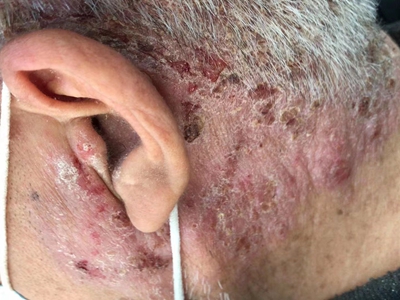 慢性湿疹患者左耳周围皮肤有大面积的红肿,红肿表面的皮肤干燥粗糙,覆有白色的皮屑,头皮部位有曲线式的黑褐色结痂,还能看到几处红色糜烂面,患者自觉有轻微的疼痛。