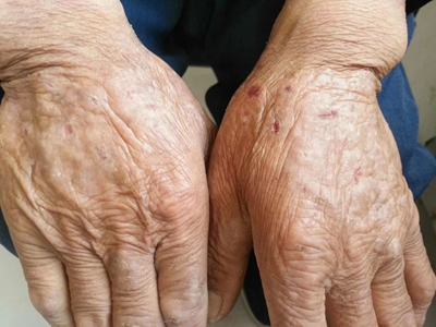 慢性湿疹患者的症状出现苔藓样变化,患处皮损增生性肥厚,因色素沉积呈灰褐色。增生肥厚处皱褶明显,局部偶有色素脱失斑,表面呈蜡样光泽。