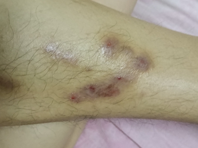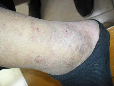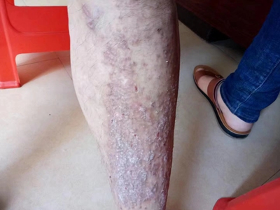 慢性湿疹患者下肢及脚踝部位有大面积苔藓样斑块,斑块表面有灰白色结痂,局部皮肤粗糙肥厚,部分结痂脱落伴有渗液症状,患者自觉有瘙痒等症状。