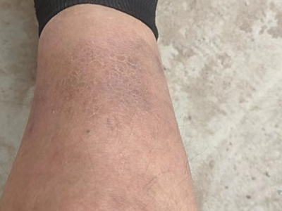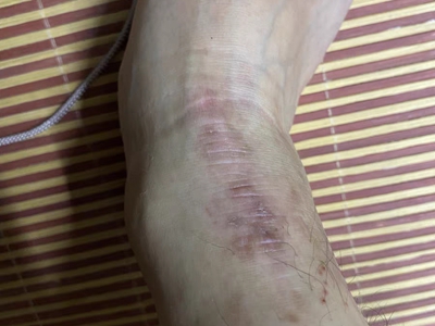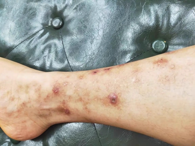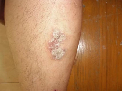 慢性湿疹脚踝上有一大块褐色斑块伴有糜烂图