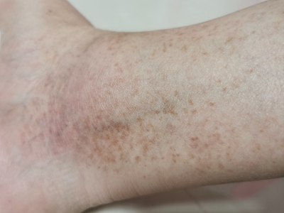 慢性湿疹恢复后留有色素沉着斑,在脚背上出现数个米粒至扁豆大小的褐色斑点,颜色深浅不一,界限不清晰,按压不褪色,自觉不美观者可遵医嘱使用激光去除。