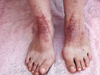 慢性湿疹症状严重时引起局部皮肤红肿,足背皮肤常见大小不一的红色浸润性斑块,常扩展至踝部及小腿远端,红斑上常附着白色鳞屑,出现瘙痒或疼痛等症状。