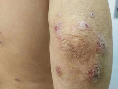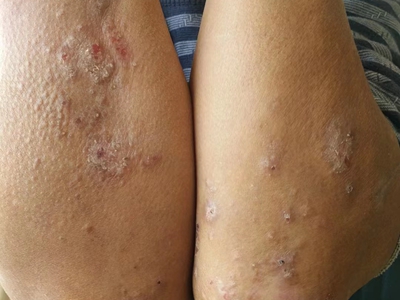 慢性湿疹累及脚踝周围的皮肤时,局部出现零散的结痂样改变,呈现褐色的皮肤粗糙,部分邻近皮损相互融合,伴明显的瘙痒感,搔抓导致皮损破溃。