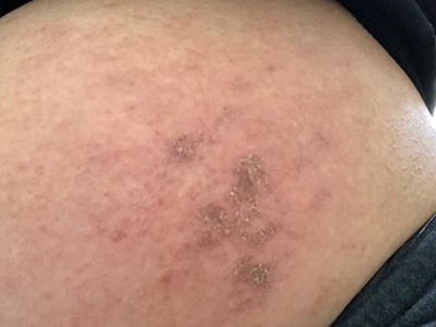 慢性湿疹皮肤损害分布于背部,典型表现为皮肤干燥、粗糙,可以因搔抓而出现多个点状血痂。确诊后患者需遵医嘱进行药物治疗,并注意局部保护。