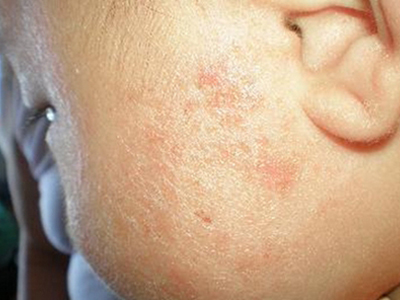 慢性湿疹发生于面部,表现为患儿皮肤粗糙增厚且干燥,大量皮纹相互交织成网,并在其上附着有许多针尖至粟粒大小的白色鳞屑,耳朵前方见有多个散在的形状不规则的暗红色斑块。