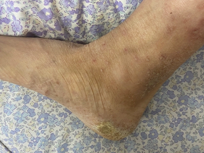 慢性湿疹脚踝内侧皮肤增厚结痂图
