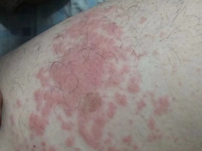 慢性湿疹的症状发生在背部,皮损部位皮肤粗糙、增厚,表面纹路加深,周围皮肤轻微发红,边界较模糊,形状不规则,患者自觉瘙痒明显,呈阵发性。