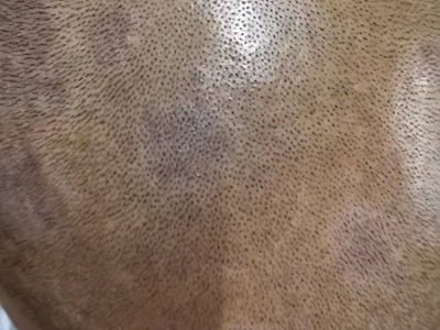 慢性湿疹患者头顶处有红色斑块,斑块大小不等,初起为针尖大小红色点点,后逐渐增大,向周围皮肤蔓延,形成较大斑块,通常伴有瘙痒症状。