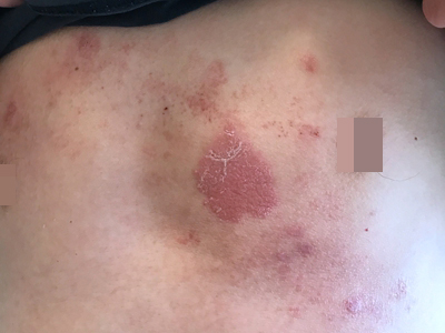 慢性湿疹发生于背部,出现皮肤粗糙、干燥等症状,表面常附着鳞屑与痂皮,痒感明显,抓挠后痂皮脱落,露出红色皮损,常长期反复发作。