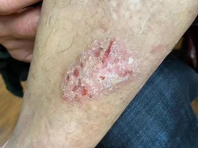 慢性湿疹脚踝有一片肥厚褐色斑块,有儿童拳头大小,扁平凸起与皮肤表面,形状不规则,斑块上附有白色鳞屑,还有多个黄豆大小的破溃,露出红色湿润基底面。