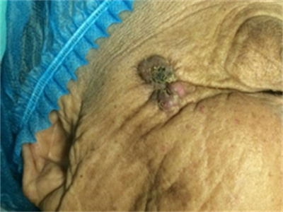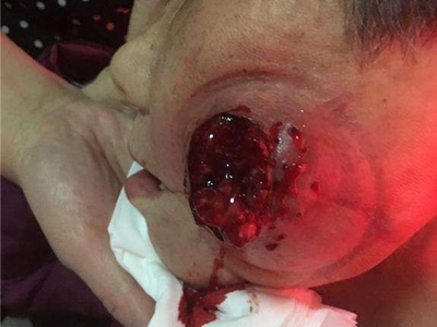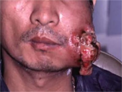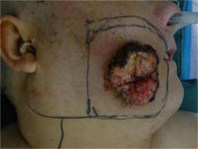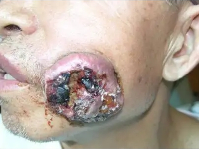 颊癌患者面部长个肿瘤,是从口腔内穿孔而来,表面凹凸不平,整体呈紫红色,中间有一大块圆形破溃,露出糜烂面,边缘发黑,有发展扩大的趋势。