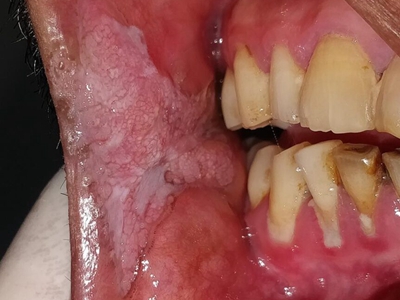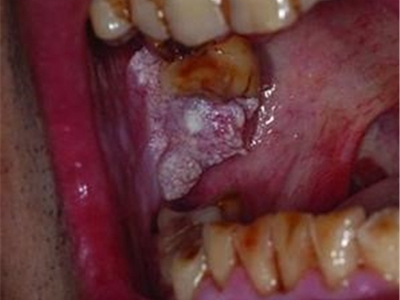 颊癌患者右侧颊黏膜有一片斑块样隆起,表面有白色点状物质覆盖,呈溃疡糜烂样,形状不规则,为颊癌早期症状,生长较快,容易向四周及深部组织发展。