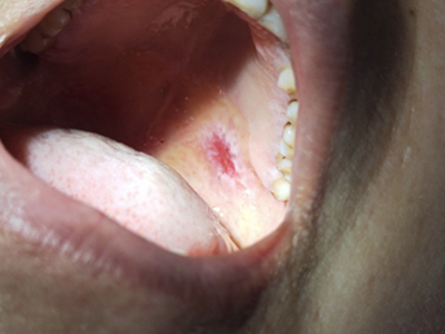 颊癌颊黏膜上有一块扁豆大小的糜烂性红斑图