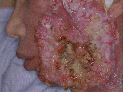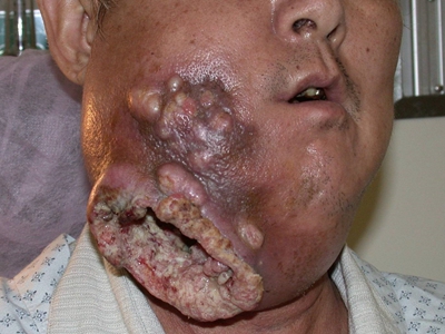 颊癌患者右侧脸颊有大块溃疡,溃疡边缘肿大凸起,溃疡面和周围皮肤也有凸起的肉球和肉芽,伴有少量的黑褐色结痂和黄色的分泌物。
