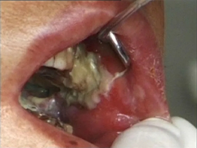 颊癌患者一侧颊黏膜上出现不规则的凸起性肉赘,上有颗粒状肉芽,附有少量黄白色脓液,肉赘周围口腔黏膜附有一层较厚的白膜,提示癌变处于进展的状态。