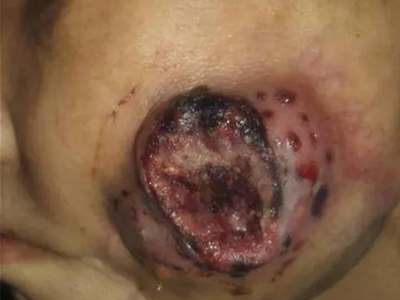 颊癌患者面部出现破溃、穿孔、糜烂,破溃面积较大,中间凹陷成孔,边缘凸起,凹陷部位糜烂潮湿,有灰白色物质附着,周围皮肤有小的肿瘤隆起,周围为褐色色素沉着。