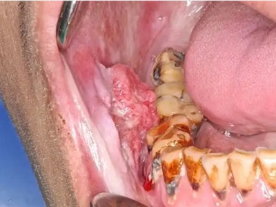 颊癌好发于口腔磨牙区附近,会出现口腔黏膜糜烂、破溃,表面有颗粒状肉芽生长,大小不等,生长较快,容易向四周及深层组织浸润。