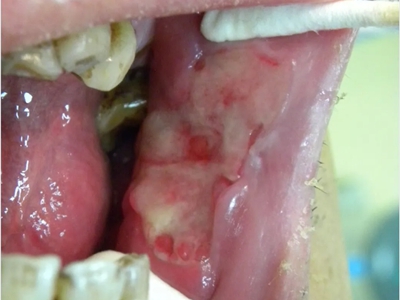 颊癌患者左侧脸颊出现一个形状不规则的大肉瘤,肉瘤表面凹凸不平,中间位置出现溃疡、糜烂,伴有血液和黄白色分泌物渗出,患者疼痛明显,张口受限。