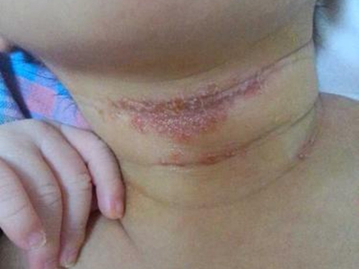 干燥型婴儿湿疹前颈部位发红,形成浅表溃疡,皮损呈深红色,形态不规则,边界较清晰,皮损表面有灰白色鳞屑,伴有刺痛和瘙痒感。