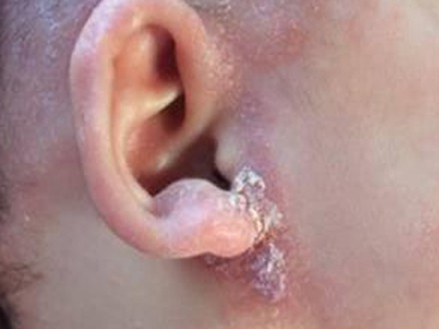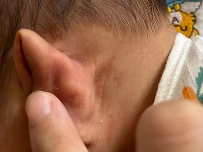 干燥型婴儿湿疹出现在耳周时,会见到耳周皮肤大面积发红,皮损干燥,有灰白色鳞屑或薄层痂皮覆盖,伴有脱屑和明显瘙痒感,搔抓后症状加重,需注意保护皮肤,避免婴儿抓挠患处。