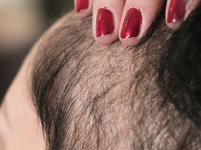 拔毛癖患者常在耳朵上方拔头发,表现为大面积脱发,但有少量折断的发根存在,而且常因局部感染导致点片状的红斑出现,有轻微疼痛感。