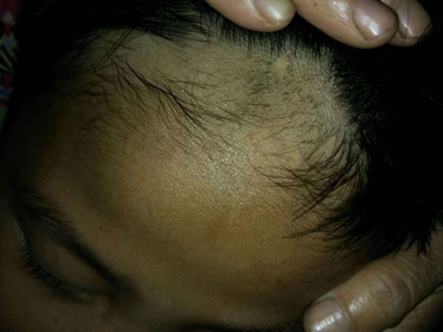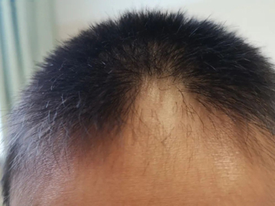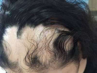 拔毛癖患者表现为额头上面区域有一片脱发,此处毛发脱落,裸露头皮,形状不规则,多考虑与患者曾经受过心理创伤相关,需采取心理治疗。