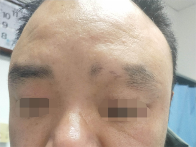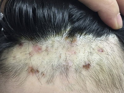 拔毛癖好发于前额部,表现为前额毛发减少,拔发区域残根清晰可见,拔毛时用力过大,可造成皮肤破溃,形成大小不等的暗红色血痂,触之痛感明显。
