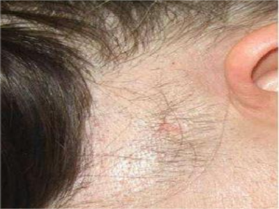 拔毛癖可出现在鬓角,表现为受累区域的头发缺失、稀少,但是并未完全脱落,可在周围发现长短不一的散在头发,严重者可出现眉毛、睫毛的缺失。