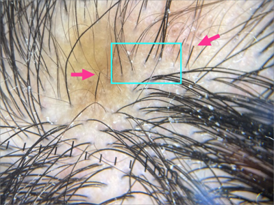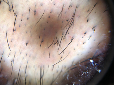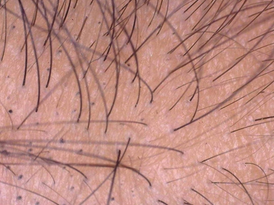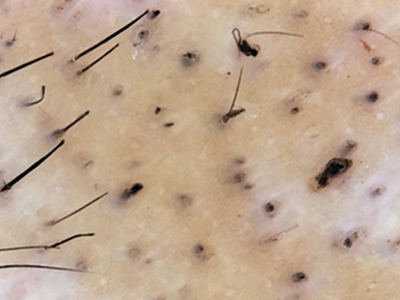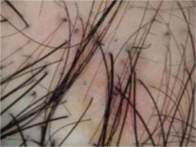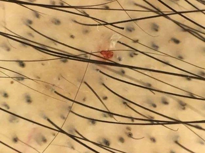 拔毛癖患者头皮镜下观察可见散在分布的残发,长短、粗细均不一致,亦可见密密麻麻的芝麻状小黑点,内有残留的发根,如因用力较大造成损伤,会形成小块血痂。