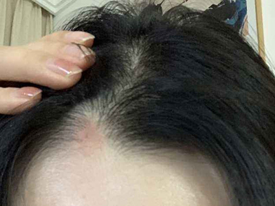 拔毛癖患者会出现有意识地用镊子或手强迫性拔除自己前额头的头发,从而形成一个脱发区,导致毛囊受损,局部会出现淡红色、轻微肿胀的斑块。