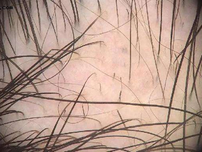 拔毛癖毛发镜下可见大量折断的头发,发根还残留在头皮内,毛囊清晰可见,但分布不均,有的地方较为密集,有的地方较为稀疏,可导致局部毛发稀少。